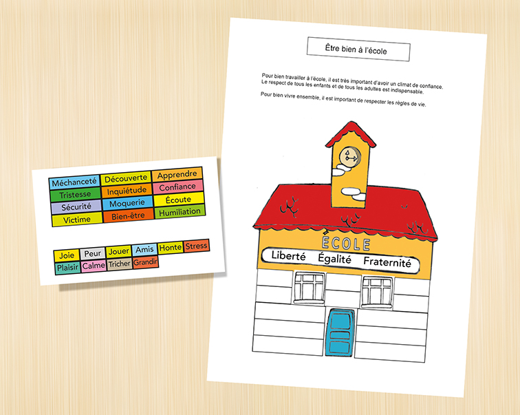 Le travail, tout d'abord réalisé à l'oral de façon collective, est repris individuellement. Les mots positifs choisis viennent "construire" l'école illustrée.